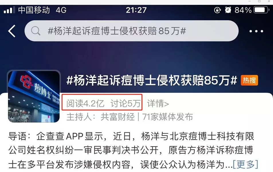 据此,法院认为北京痘博士公司以营利目的擅用杨洋肖像、姓名,严重侵犯了杨洋的肖像权、姓名权。判决结果为,北京痘博士向杨洋赔偿共计85万元。此事曝光后,迅速登上新浪微博热搜榜。截止目前,话题#杨洋起诉痘博士侵权获赔85万#阅读人次已达4.2亿。