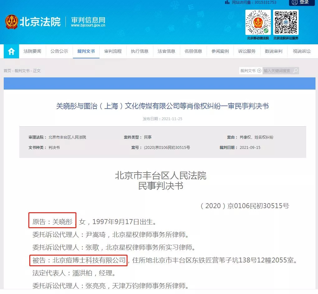 11月25日,北京法院审判信息网公开发布关晓彤与北京痘博士等相关肖像权纠纷一审法律文书。原告为关晓彤,被告为北京痘博士、图治(上海)文化传媒有限公司。文书显示,原告关晓彤诉称,北京上海等地的“痘博士”连锁祛痘机构在实体店铺中张贴、使用含有原告肖像所制作的海报、易拉宝等宣传物料,用以销售旗下产品。被告的行为极易使消费者误以为原告与涉案产品、品牌存在合作关系,是对消费者的严重欺诈。