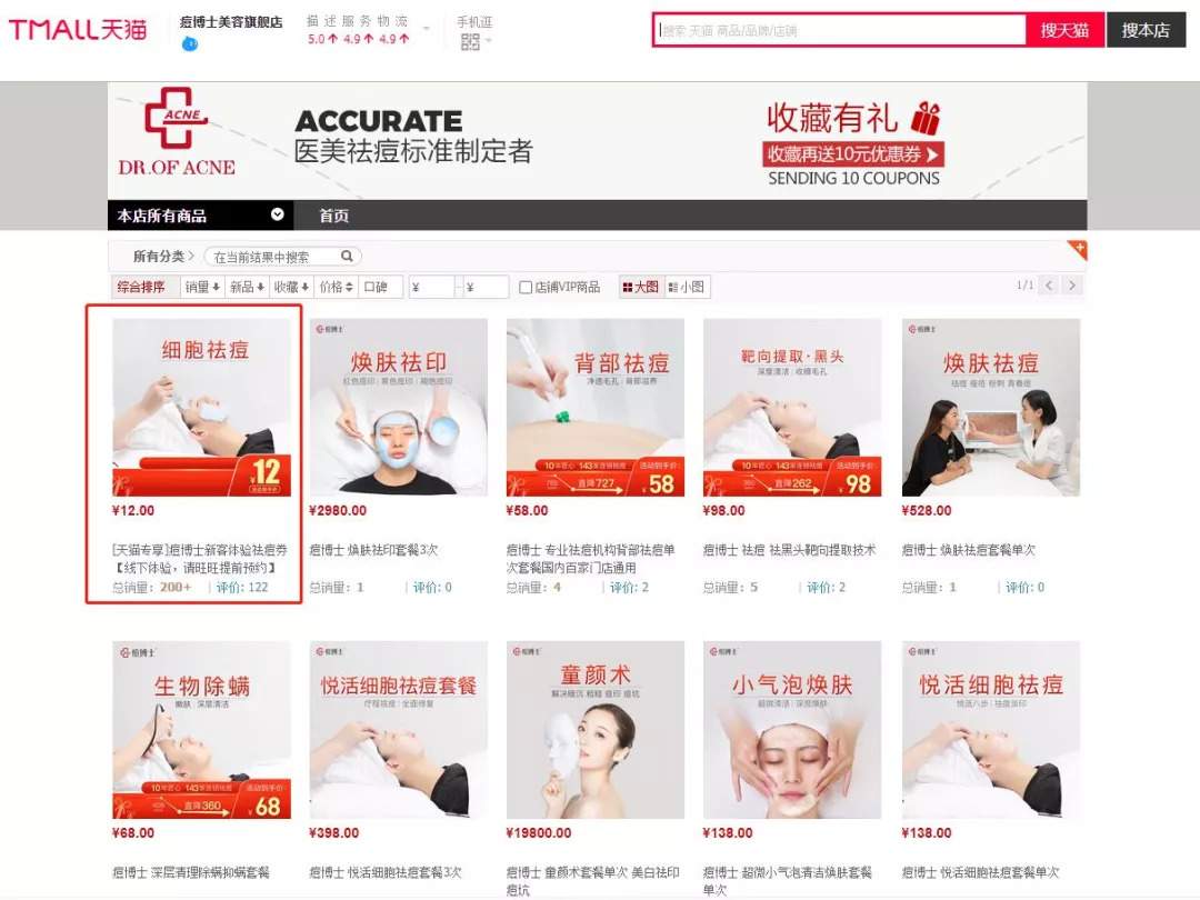 根据上述消费者投诉帖子描述的信息,青眼今日在天猫平台上搜索到“痘博士美容旗舰店”。据该店铺首页显示,目前共有19个产品在售,价格区间在12元到1.98万元之间。其中,销售量最高的产品为12元的痘博士新客体验祛痘券,总销量为200+。青眼还调查发现,据痘博士美容旗舰店公示的经营者相关资质信息显示,其企业名称为北京靓妆美容美发有限公司。