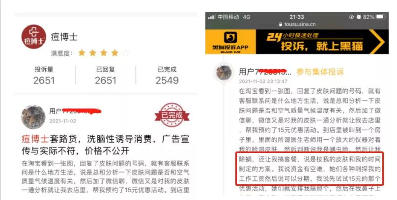除遭遇明星起诉外,在黑猫投诉上也有不少消费者投诉痘博士连锁的信息。青眼在黑猫投诉官网以“痘博士”为关键词进行搜索,显示投诉量为2651条。就在今年11月2日,有消费者在黑猫投诉平台上发布题为“痘博士套路贷,洗脑性诱导消费,广告宣传与实际不符,价格不公开”的投诉帖子,涉诉金额为1.28万元。