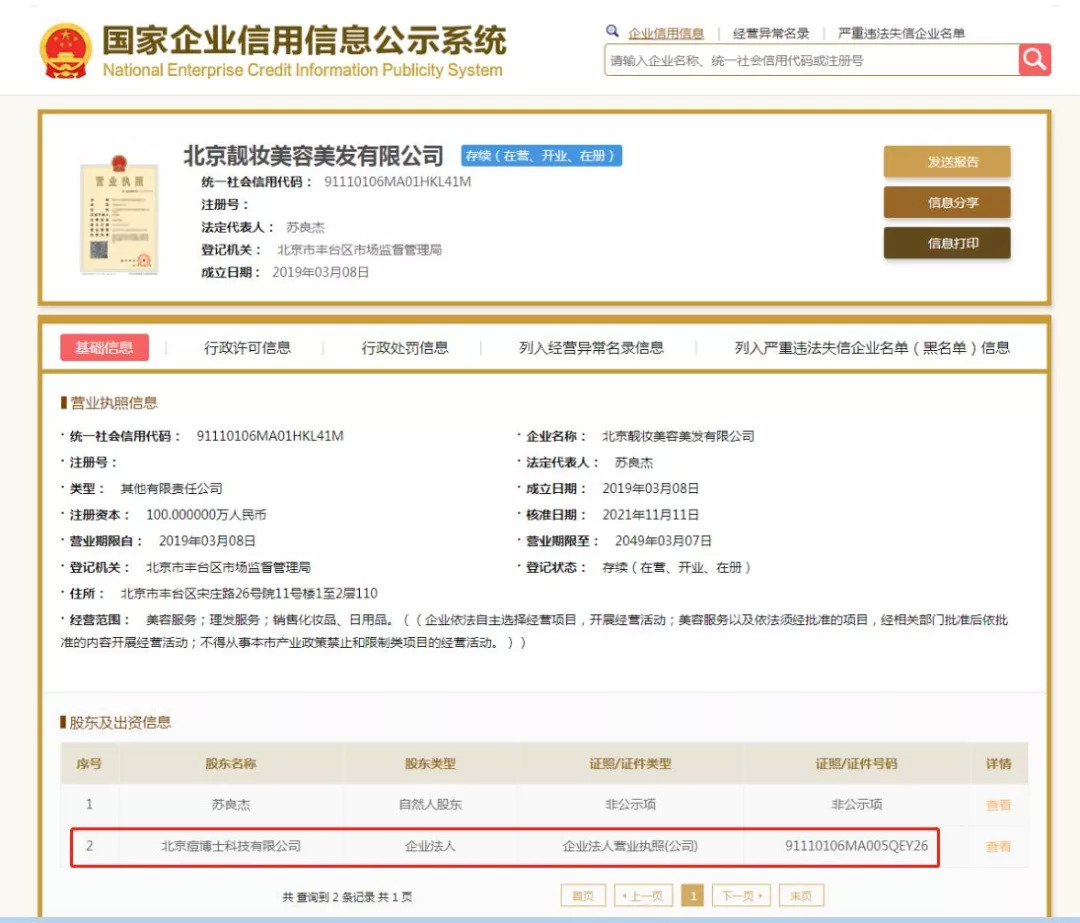 而据国家企业信用信息公示系统显示,北京靓妆成立于2019年3月8日,注册资本为100万元。股东及出资信息显示,该公司由自然人苏良杰和企业法人北京痘博士共同持股。其中,北京痘博士认缴出资额为60万元,苏良杰认缴出资额为40万元。由此可见,北京靓妆和北京痘博士存在直接的关联关系。