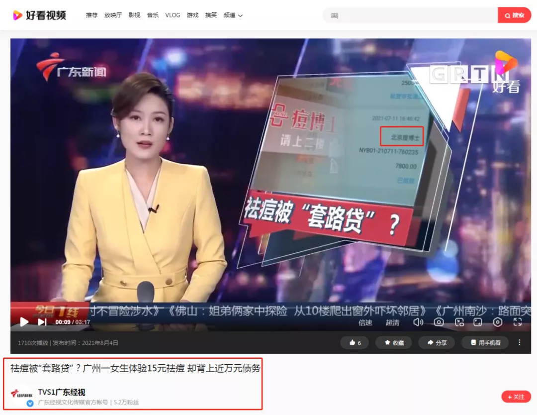 同年,浙江网络广播电视台曾先后4次曝光“痘博士”连锁祛痘服务体验存在“套路贷”的情况,涉及门店分布在萧山区、江干区、义乌等地。今年8月,广东广播电视台民生新闻栏目《今日一线》还曾报道痘博士连锁疑似存在“套路贷”情形。报道称,一名20岁的学生根据一则15元体验祛痘的网络广告到店,被告知激素治理疗程一共7800元,没有钱可分期付款。当事人根据引导下载即分期APP,并签署纸质合同,分12期每期735.8元,共需还款8829.6元。据了解,广州白云区市场监管部门已介入调查处理。