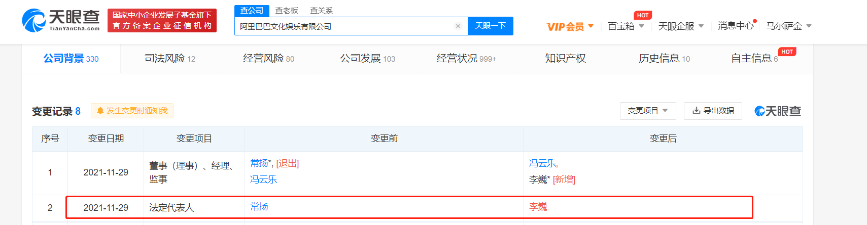 据天眼查APP显示,11月29日,阿里巴巴文化娱乐有限公司发生工商变更,法定代表人由常扬变更为李巍。