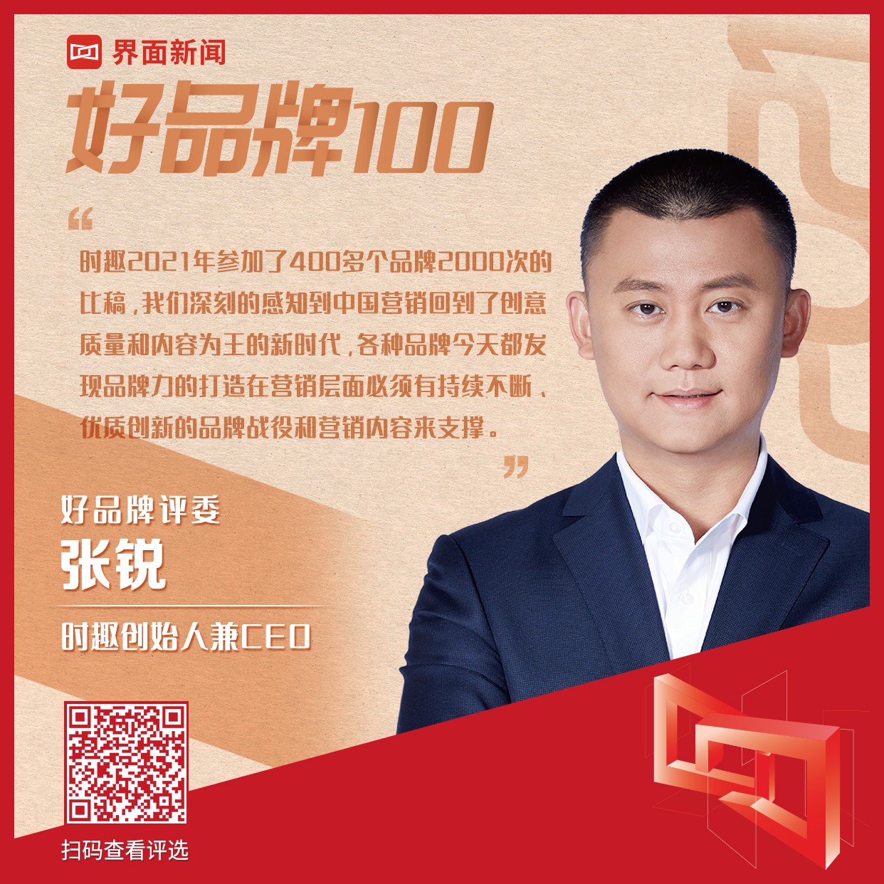 聚集百位行业大牛,共同寻找“讲好品牌故事、拥有核心竞争力、持续创新、面向国际”的好品牌。2021【好品牌100】终审正在进行中,历经自主申报和网络投票,共计600+品牌正在激烈角逐最终上榜机会(相关内容回顾:2021【好品牌100】入围名单公布,谁是你心中的最佳品牌?)。终榜将于12月15日第四届【界面财经年会】现场揭晓。
