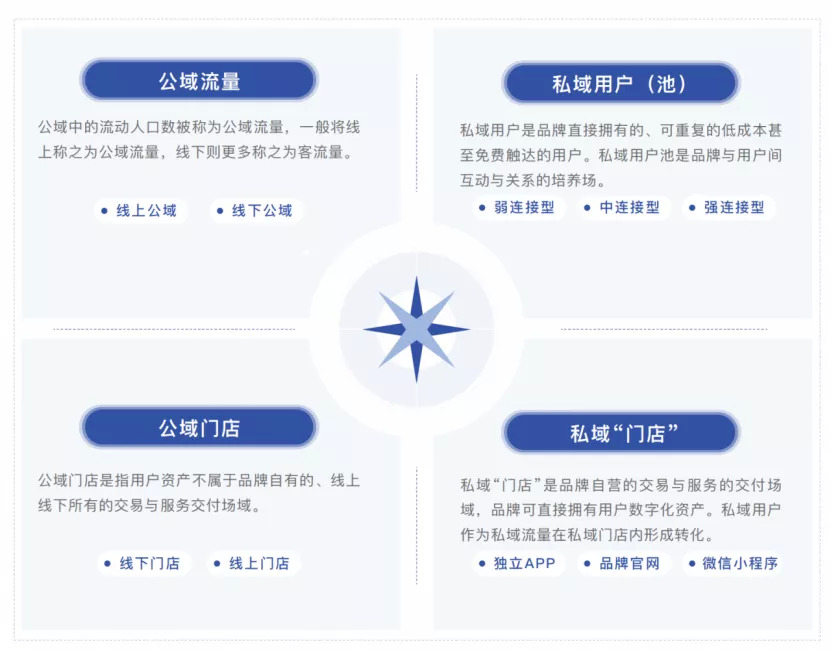 《指引》将私域定义为,品牌或企业直接拥有的,可重复的低成本甚至免费触达用户的场域,并将私域划分为私域用户池与私域门店两大阵地。