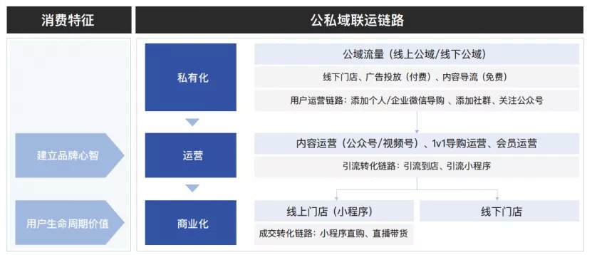 尽管零售业不同细分领域的特性和经营模式差异显著,但公私域联运的核心链路基本涵盖三个关键步骤——公域流量的私有化沉淀、私域用户池的运营和私域的商业化实现。