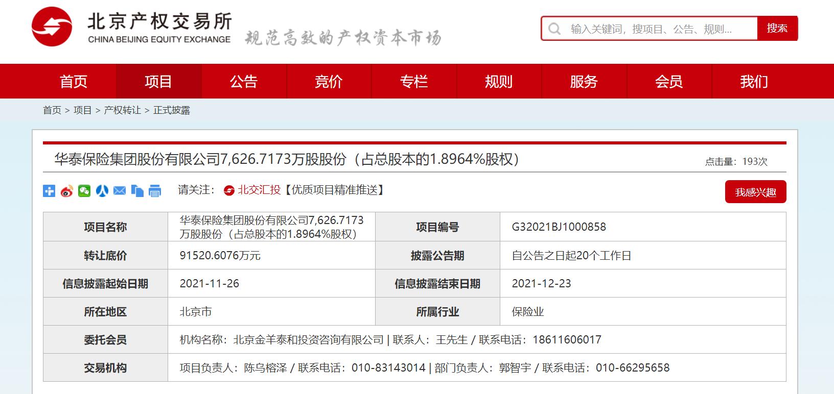 2021年11月26日,北京产权交易所披露的信息显示,中谷粮油集团有限公司拟挂牌转让其持有的华泰保险7626.72万股股份(占总股本的1.8964%),转让价格为9.15亿元。