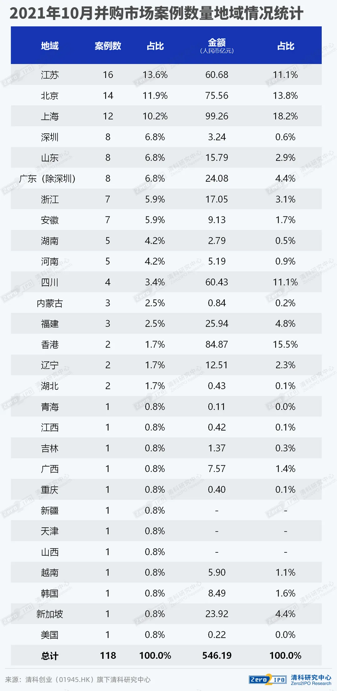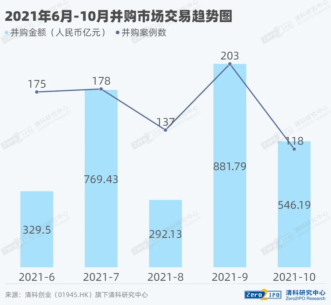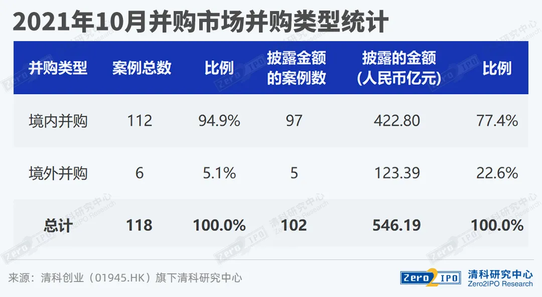 根据清科创业(01945.hk)旗下清科研究中心数据,2021年10月中国并购市场共完成118笔并购交易,数量环比下降41.9%,同比下降4.8%。其中披露金额的有102笔,交易总金额约为546.19亿人民币,环比下降38.1%,同比上升2.0%。