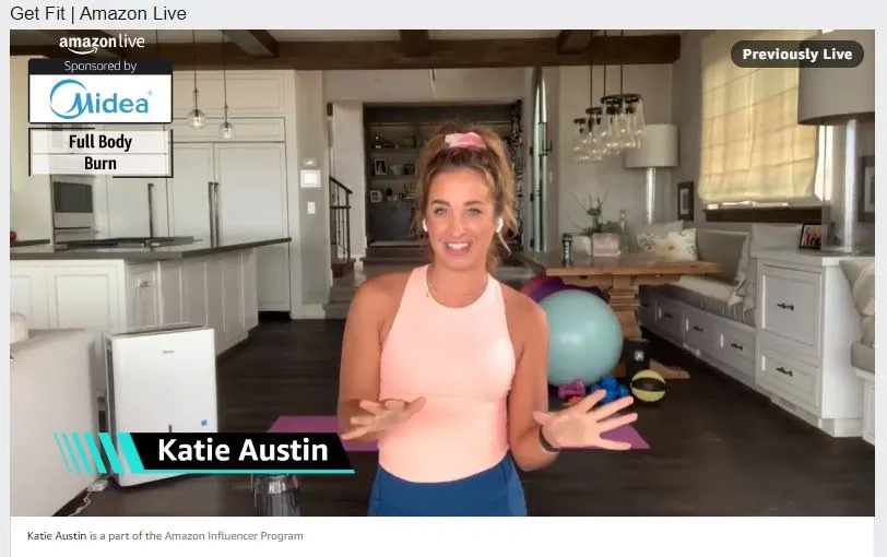 (健身教练凯蒂·奥斯汀在Amazon Live上直播自己的锻炼过程。在直播期间,她会休息一下,宣传赞助品牌的除湿机。在视频下方,她使用的产品(例如安德玛鞋)的链接会在屏幕上滚动/图源:亚马逊直播)