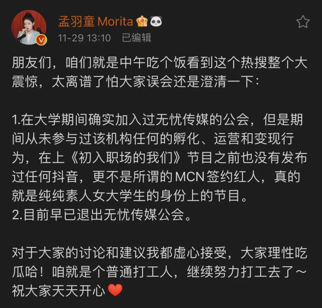 孟羽童很快在微博上作出了回应:“从未参与过该机构任何的孵化、运营和变现行为,更不是所谓的MCN签约红人,真的就是纯纯素人女大学生的身份上的节目。”