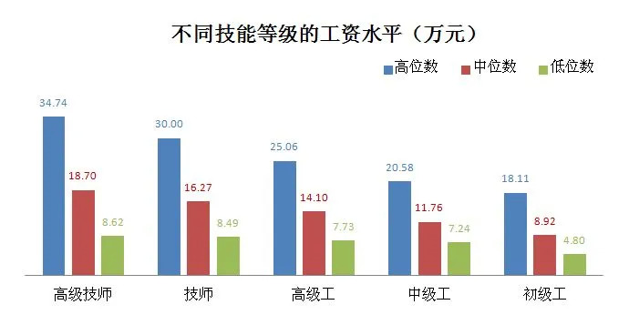 从不同技能等级的技能人才工资来看,技能等级越高,工资水平越高。从中位数看,2020年高级技师为18.70万元,技师为16.27万元,高级工为14.10万元,中级工为11.76万元,初级工为8.92万元。从高位数看,高级技师为34.74万元,技师为30.00万元,高级工为25.06万元,中级工为20.58万元,初级工为18.11万元。