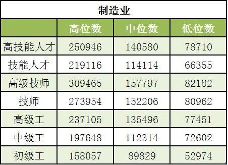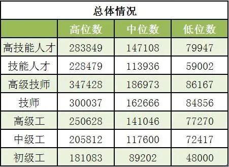 技能人才市场工资价位数据指技能劳动者在2020年取得的全部工资性收入,包括基本工资、奖金、津贴、补贴、加班工资等。将每个技能人才的工资水平从高到低排序,处于90%位置的技能人才工资为高位数,处于50%位置的为中位数,处于10%位置的为低位数。