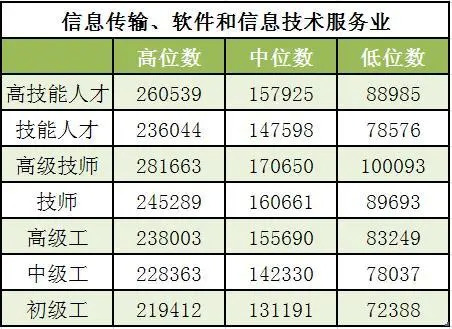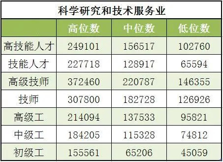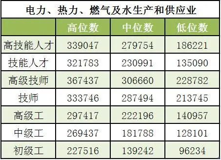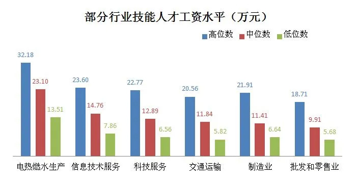 从行业来看,电力热力燃气及水生产和供应业、信息传输软件和信息技术服务业、科学研究和技术服务业技能人才工资水平较高,工资中位数分别为23.10万元、14.76万元和12.89万元,比全部技能人才工资中位数(11.39万元)分别高11.71万元、3.37万元和1.50万元。