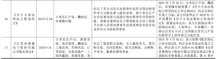 2019年12月,帝奥微与小米长江产业约定了小米出售权特别约定,若帝奥微发生出售事件且在该等出售事件中公司股东参与股权出售,则小米长江产业有权要求按与拟进行的出售事件同等的价格、条款及条件优先于管理股东及员工持股平台参与该等出售事件出售其所持有的全部或部分公司股权等事宜。