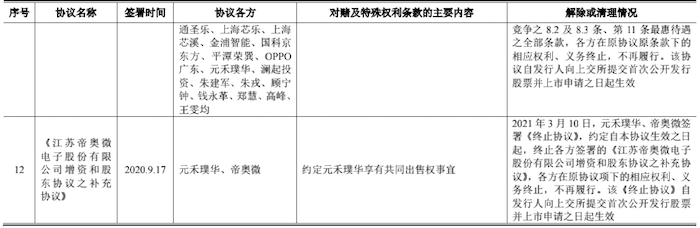 2020年9月,帝奥微再次约定元禾璞华享有共同出售权事宜。上市前,上述三项各方在原协议原条款下的相应权利、义务终止,不再履行。该协议自发行人向上交所提交首次公开发行股票并上市申请之日起生效。
