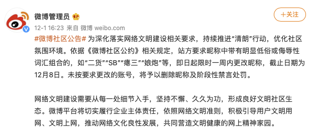 12月1日下午,@微博管理员 公告称,为深化落实网络文明建设相关要求,持续推进“清朗”行动,优化社区氛围环境。依据《微博社区公约》相关规定,站方要求昵称中带有明显低俗或侮辱性词汇组合的,如“二货”“SB”“瘪三”“娘炮”等,即日起限时一周内更改昵称,截止日期为12月8日。未按要求更改的账号,将予以删除昵称及阶段性禁言处罚。