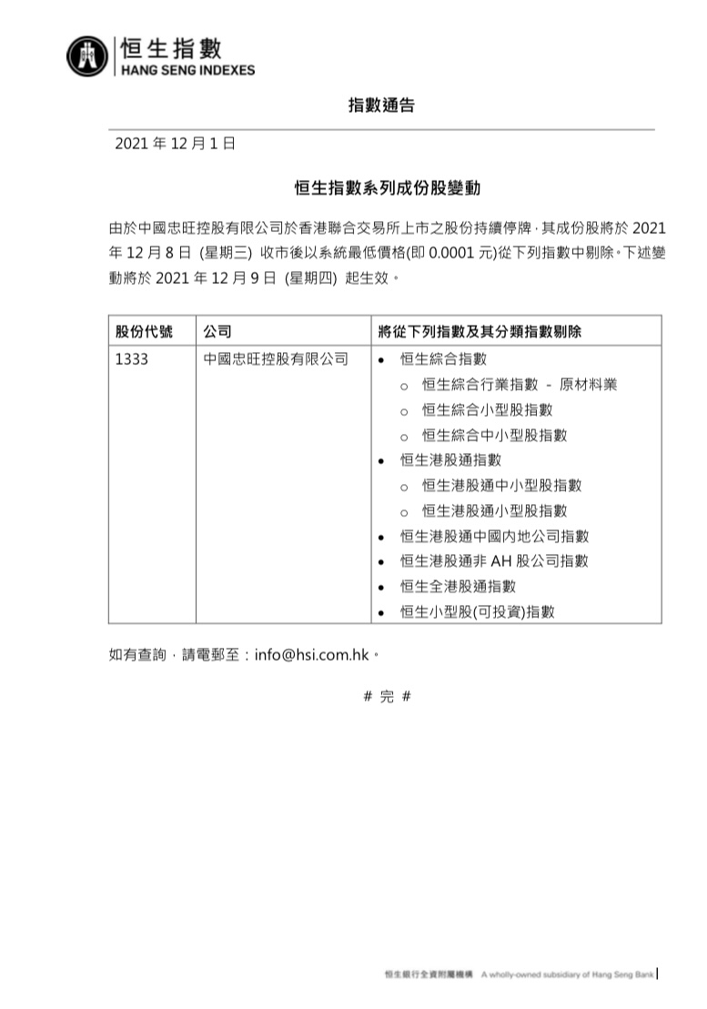 12月1日,恒生指数发布成分股变动通告称,中国忠旺因长期停牌,其成份股将于12月8日收市后以系统最低价格(即0.0001元),从恒生综合指数、恒生港股通指数等分类指数中剔除。
