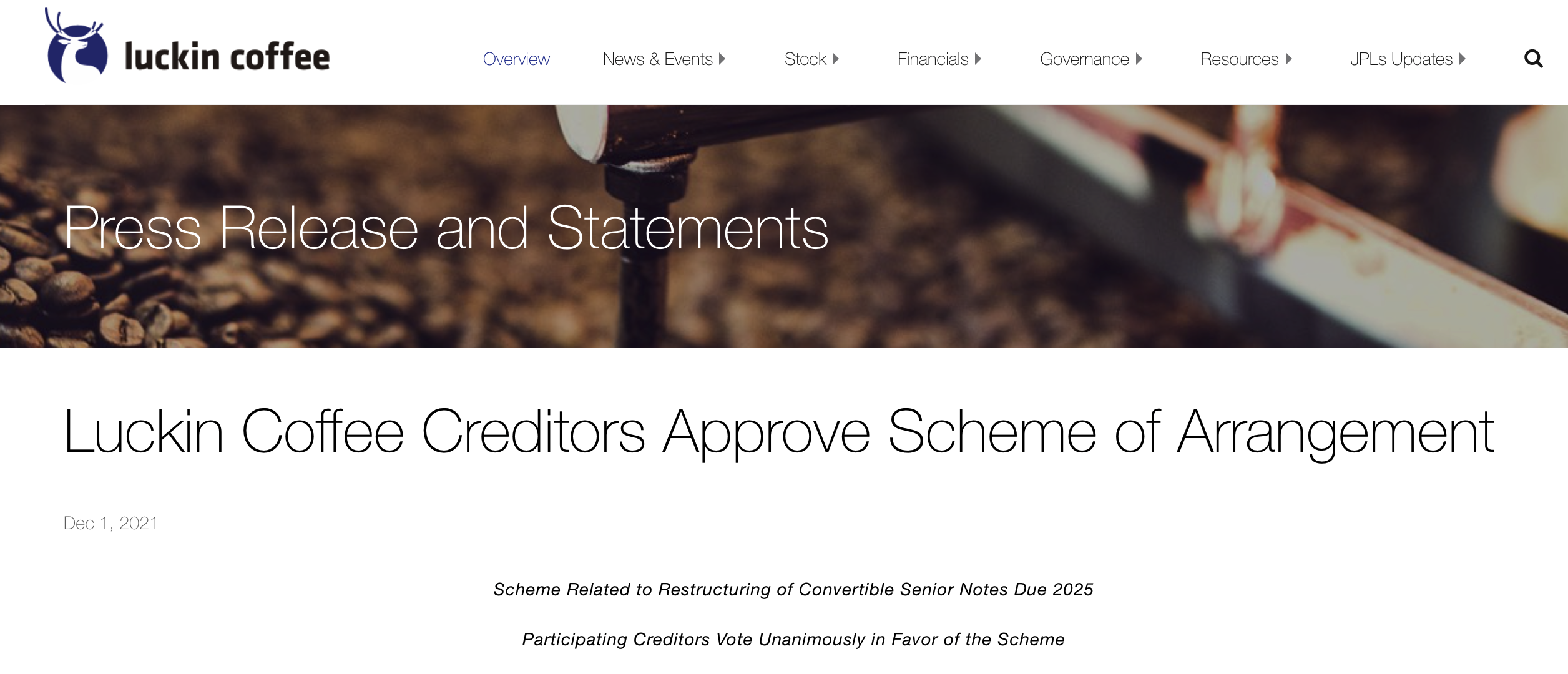12月1日晚间,瑞幸咖啡官网发布公告称,2025年到期的4.6亿美元、年息0.75%的可转换优先票据重组计划获得债权人会议投票通过。56名计划债权人出席会议,占现有票据未偿还本金总额约97.7%。因此,该计划已获必要多数计划债权人批准。