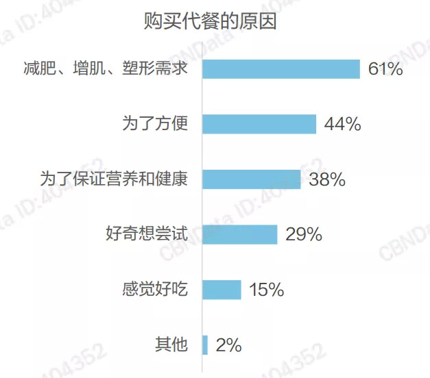数据来源:CBNData,61%的消费者购买代餐的原因是“减肥、增肌、塑性需求”