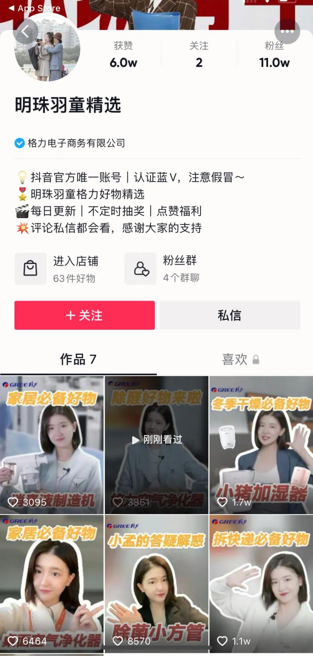 而近日,一个名为 " 明珠羽童精选 " 的抖音账号悄然注册,截至发稿该账户共发布了 7 个作品。账号的头像为董明珠与孟羽童的合照,且绑定名为 "GREE 格力小家电旗舰店 " 的店铺,共发布了包括空气净化器、电饭煲在内的 63 件商品。对此,有网友评论称 " 果然开始带货了 "。