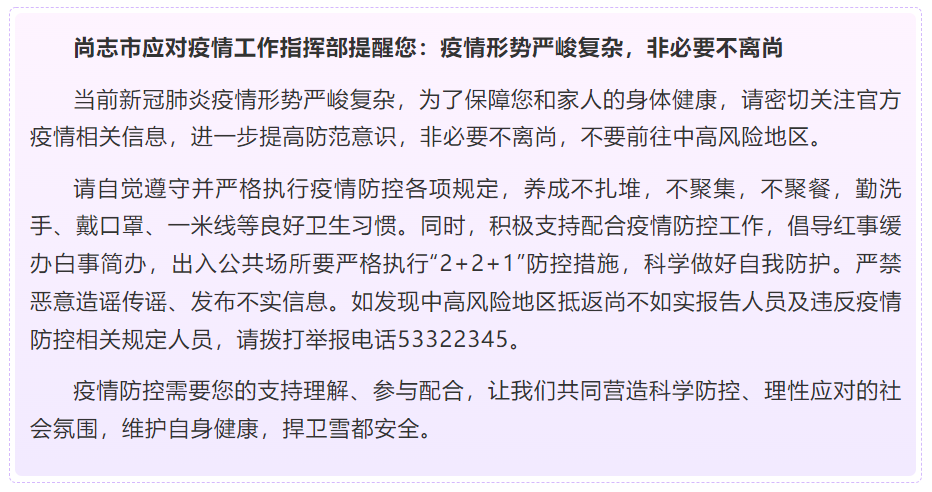 据尚志市委宣传部微信公众号,12月2日,尚志市应对疫情工作指挥部提醒:疫情形势严峻复杂,非必要不离尚。