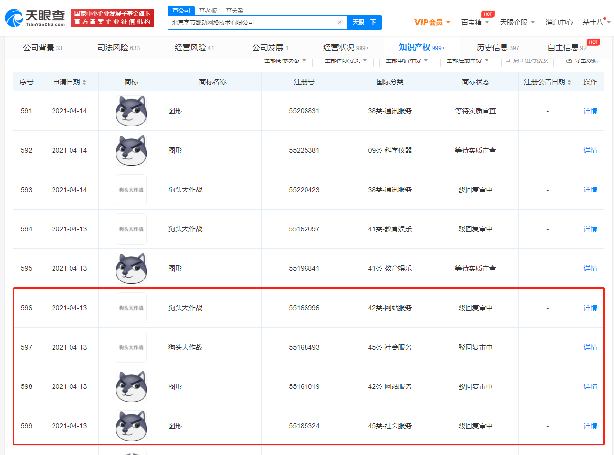 据天眼查App显示,近期,北京字节跳动网络技术有限公司申请的多枚“狗头”图形商标及“狗头大作战”商标状态变更为“驳回复审中”,国际分类涉及社会服务等。