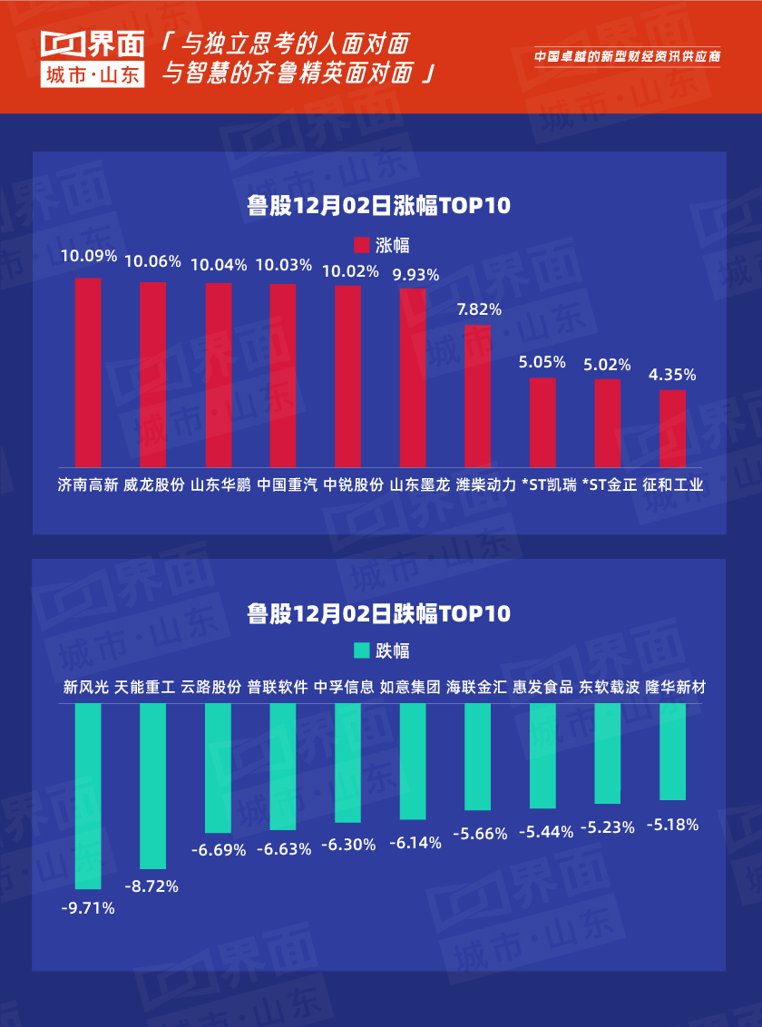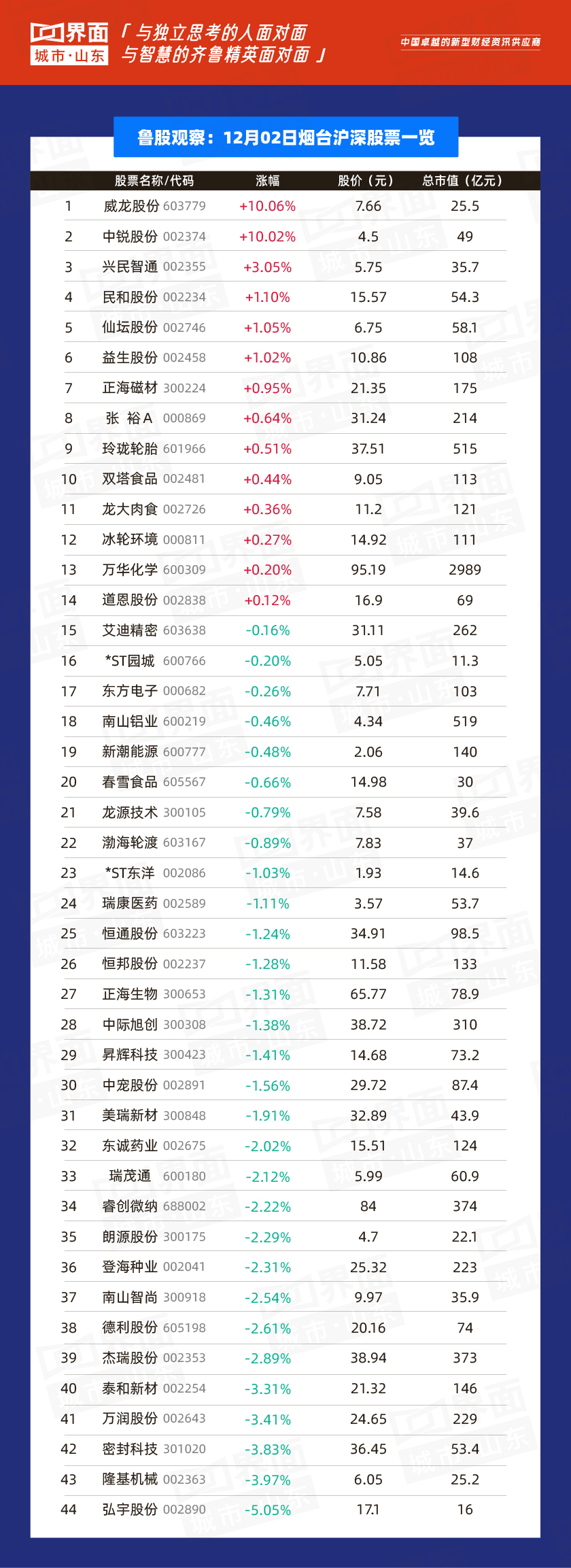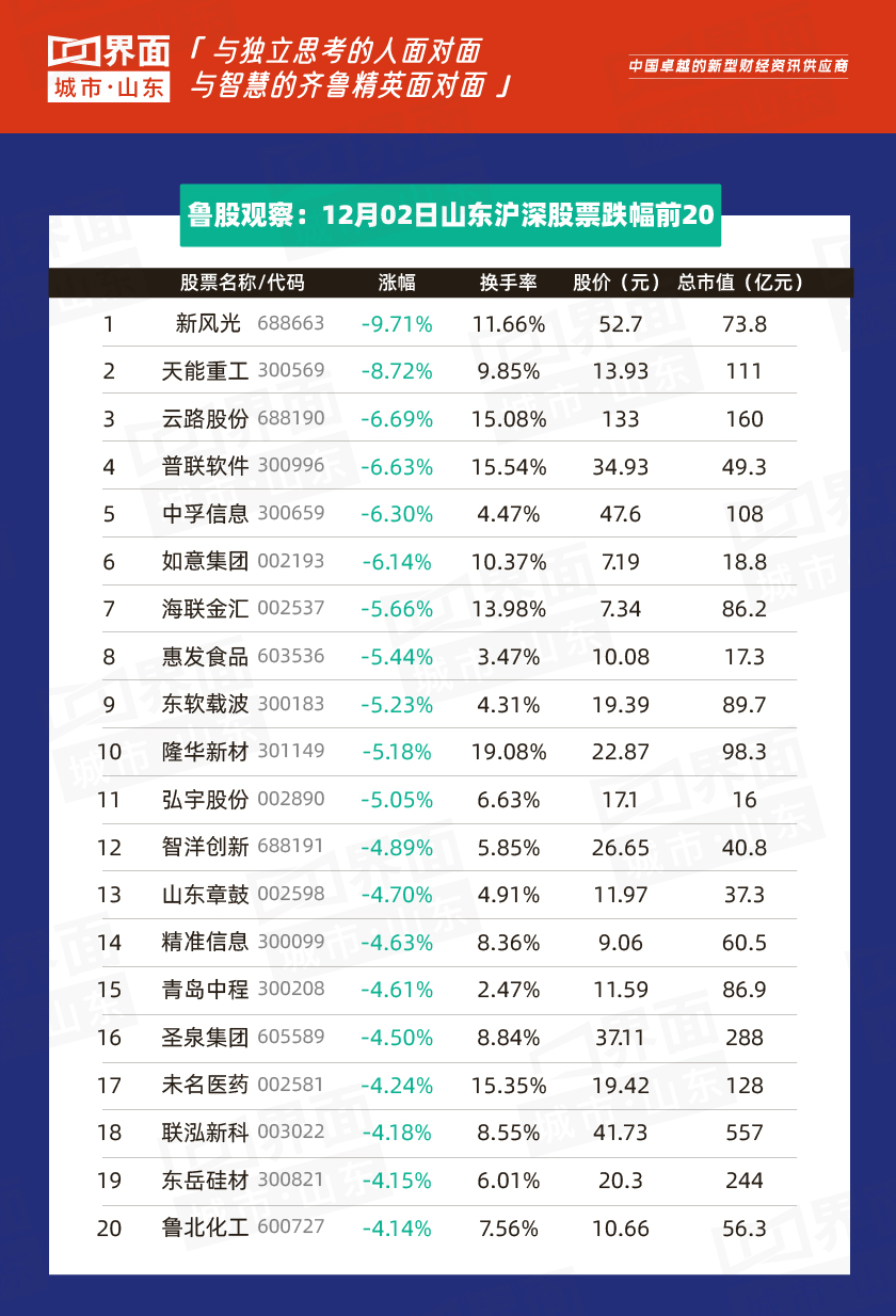 12月2日,山东省内沪深股票有75只个股上涨,179只个股下跌;总市值过千亿的有万华化学(600309)、海尔智家(600690)、歌尔股份(002241)、中航沈飞(600760)、青岛啤酒(600600)、兖州煤业(600188)、潍柴动力(000338)共7家,500亿-1000亿的共有7家,分别是联泓新科(003022)、华熙生物(688363)、山东黄金(600547)、华鲁恒升(600426)、中泰证券(600918)、玲珑轮胎(601966)、南山铝业(600219)。