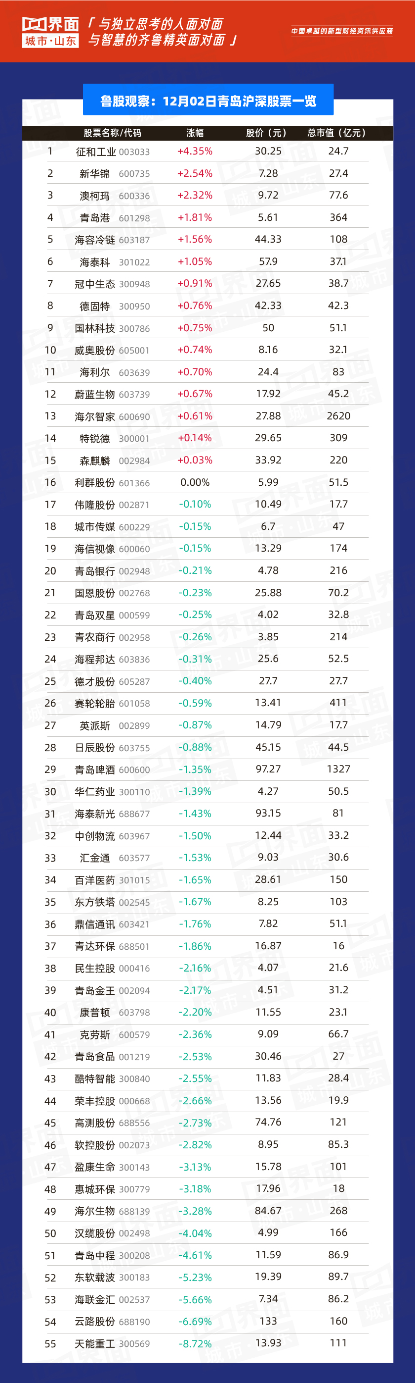 青岛市涨幅榜首:征和工业(003033),涨幅4.35%,股价30.25元,总市值24.7亿元;