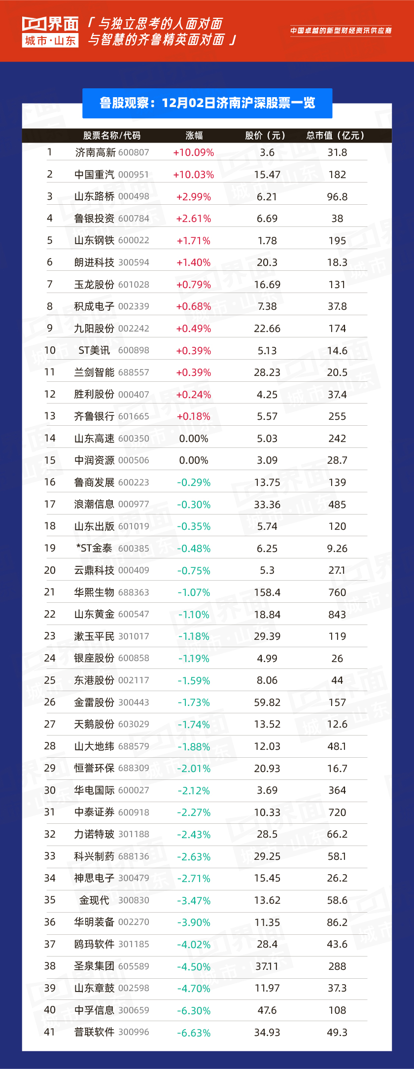 济南市涨幅榜首:济南高新(600807),涨幅10.09%,股价3.6元,总市值31.8亿元;