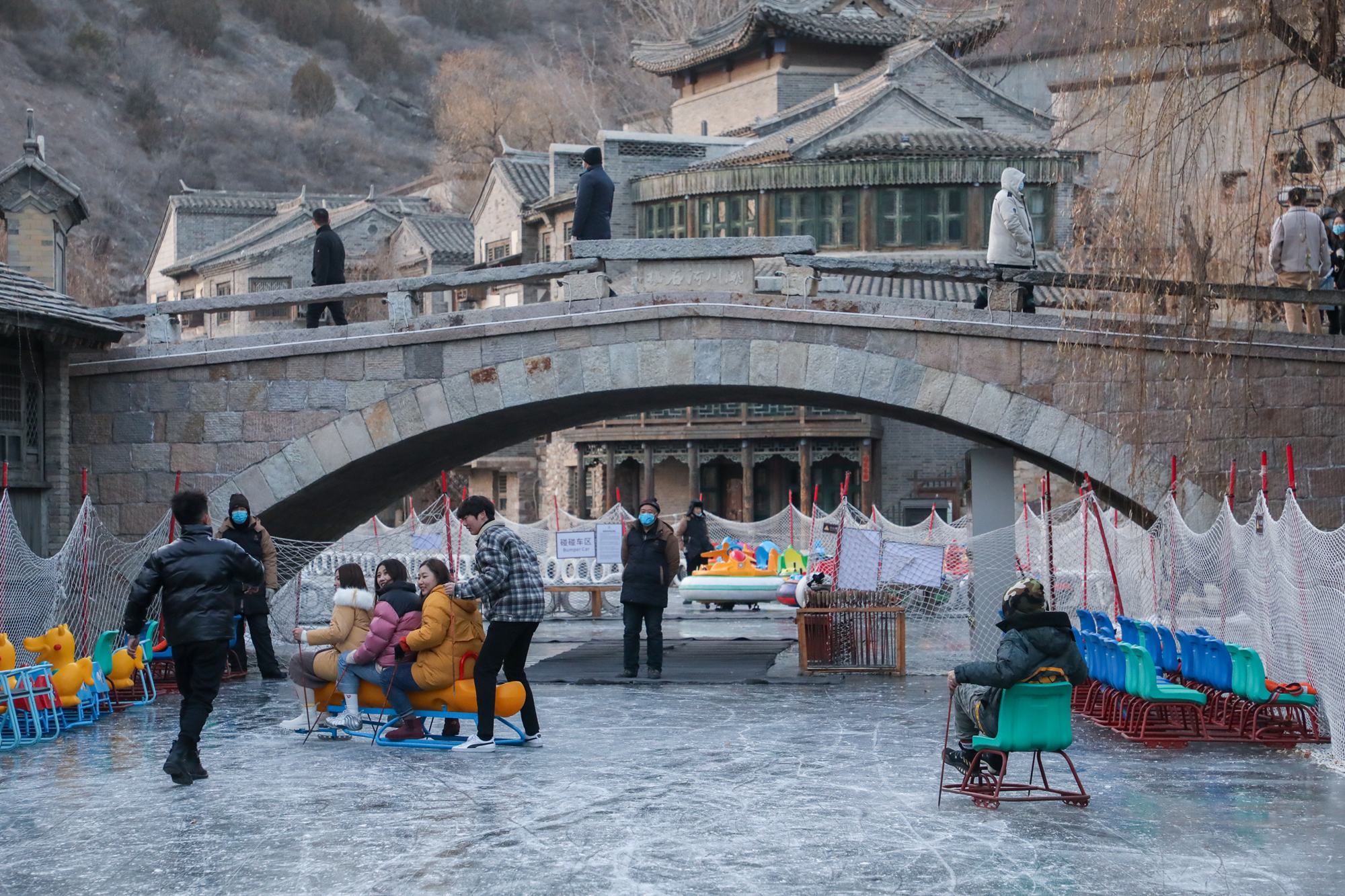同时,随着人们对冰雪项目的热情越来越高,古北水镇也就地取材,将冰块雕刻成各种形态的冰雕摆放在景区内做装饰;古北水镇冰雪嘉年华也设有冰车、冰嘎、冰滑梯、冰上碰碰车、雪地坦克等趣味体验;12月下旬开始,汤河将化身成超大冰雪娱乐体验区拉近人们与冰雪运动的距离。