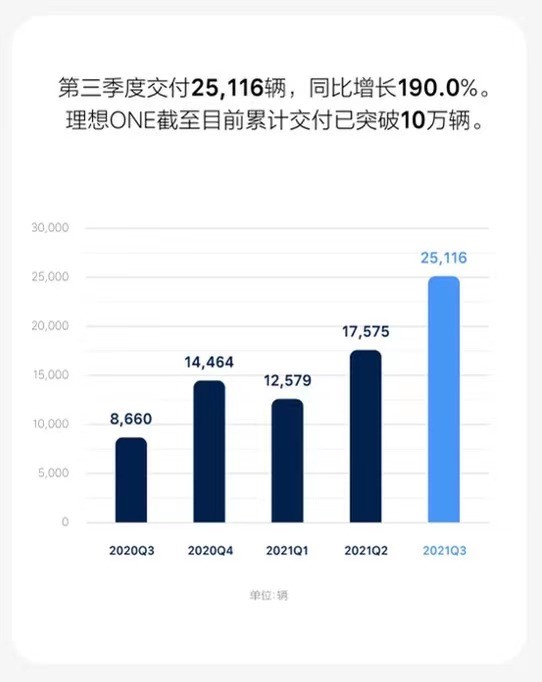 其中,理想汽车三季度车辆销售收入为73.9亿元同比增长199.7%,环比50.6%。而理想汽车三季度共计实现交付新车25,116辆,同比增长超190%以上。