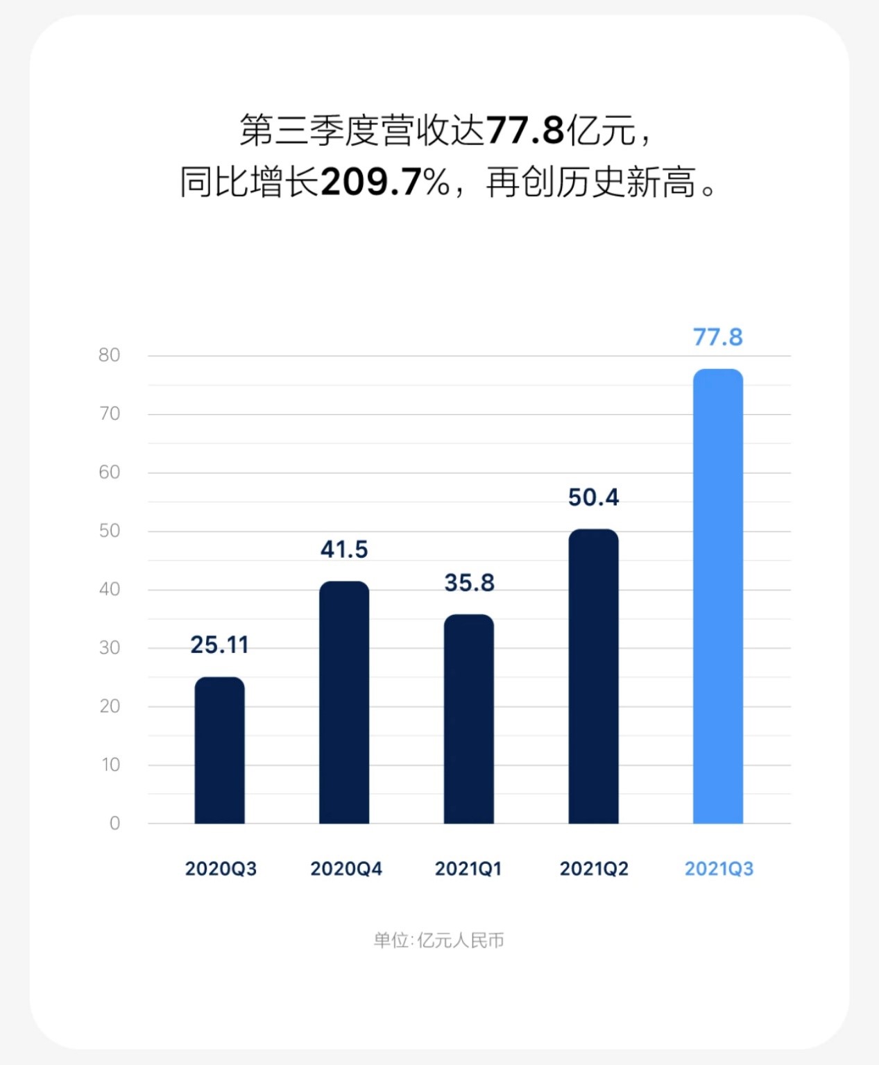 11月29日,理想汽车发布公司三季度财报。根据财报显示,理想汽车今年三季度营收总额达77.8亿元,较2020年第三季度的25.1亿元增长209.7%,较2021年第二季度的50.4亿元增长54.3%。