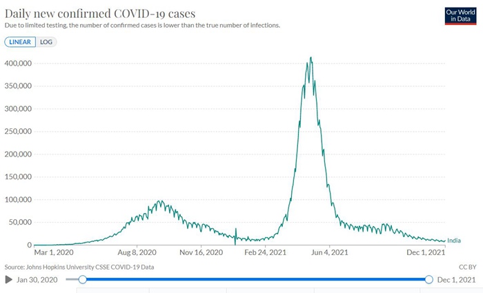 印度曾成为全球新冠疫情的“震中”。今年5月,印度单日新增确诊一度超过41万例,目前已经回落到日增1万例以下。