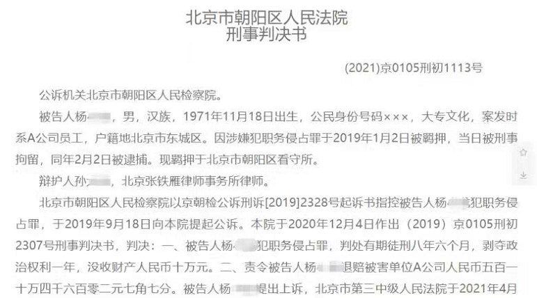 一审法院北京市朝阳区人民法院判决如下,杨某利用职务便利截留阳光财保公司支付给恒荣公司的返点佣金,并将截留钱款用于偿还个人债务等用途,已构成职务侵占罪。判处有期徒刑四年,罚金人民币十万元;退回阳光财险公司人民币189万元。