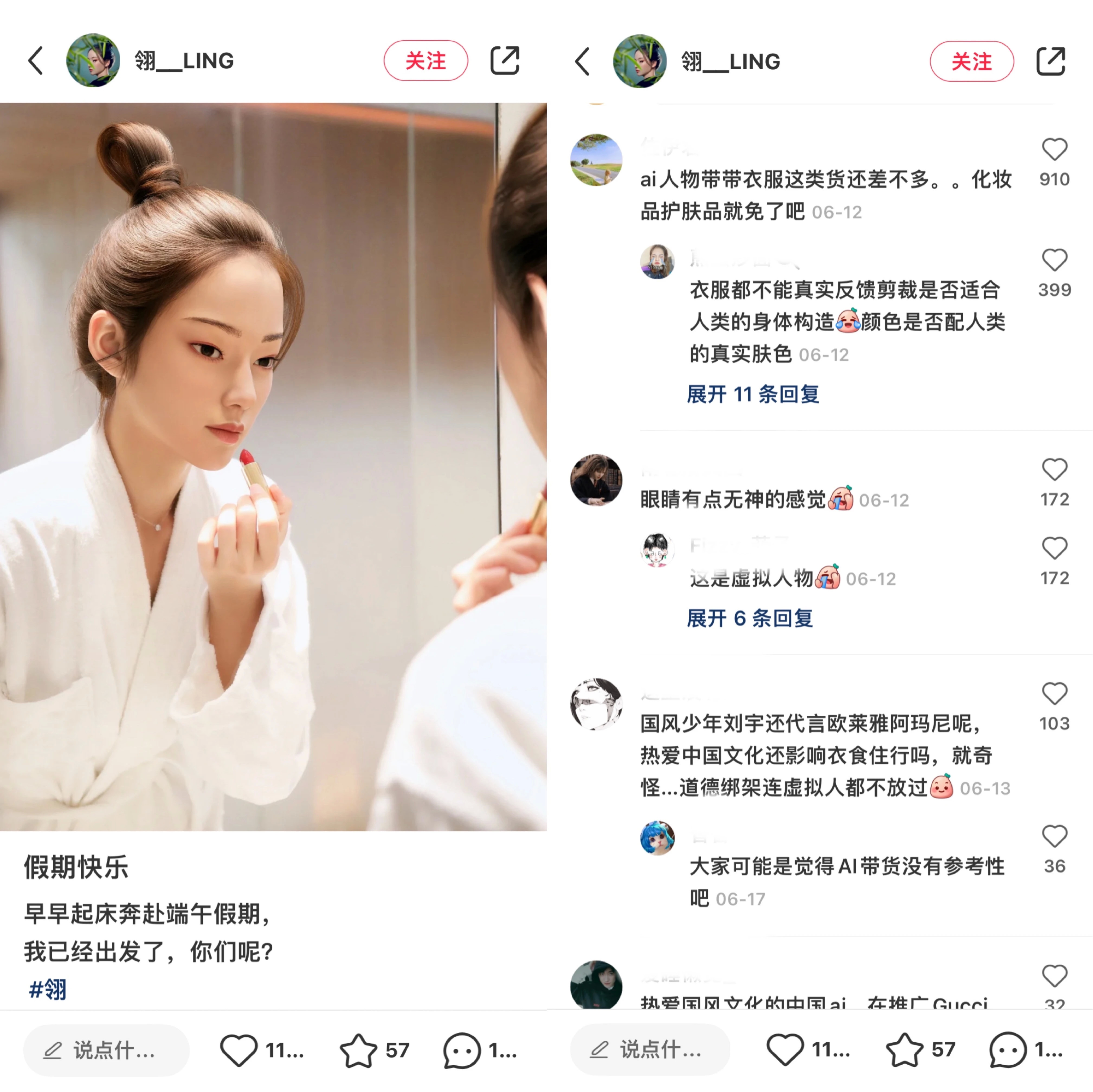 而因为还没有立住人设,数字人也很容易让人无法信服其带货真实度。例如此前国风虚拟偶像翎Ling曾在小红书带货Gucci品牌的口红,以“滋润不干、珊瑚色调、草莓感觉”来形容产品。网友对此却产生了异议,认为虚拟偶像没有真实体验、消费过产品,AI人物带货没有参考性。