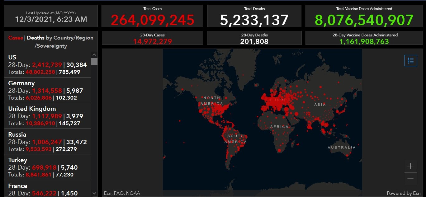 据约翰·霍普金斯大学的疫情追踪数据,截至北京时间12月3日上午8点,全球累计确诊新冠肺炎病例264099245例,累计死亡5233137例,接种疫苗超80.7亿剂次。