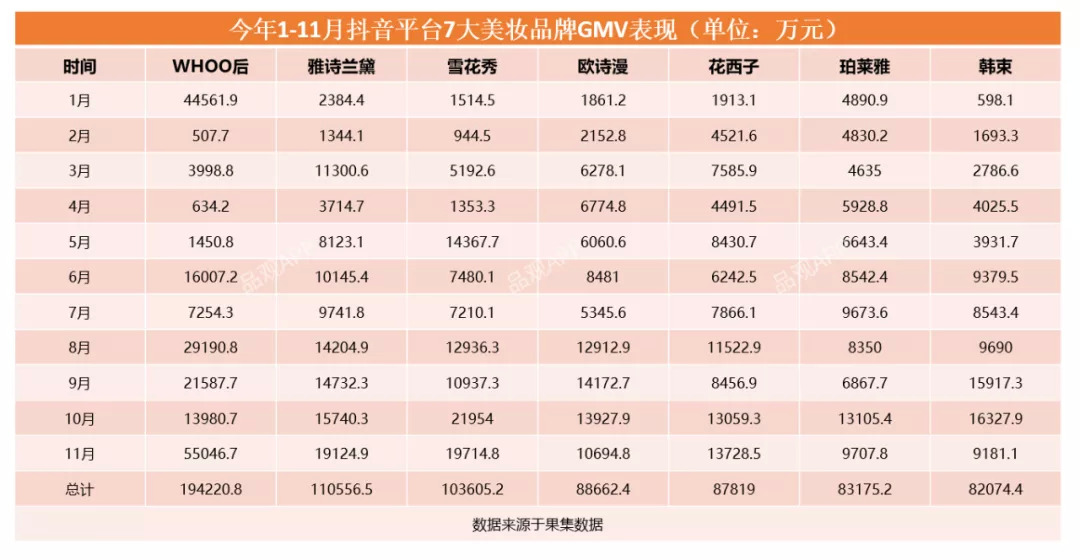 其中,WHOO后以累计19亿元的GMV位列总榜第一。在过去11个月中,其有5个月时间都排名GMV第一。