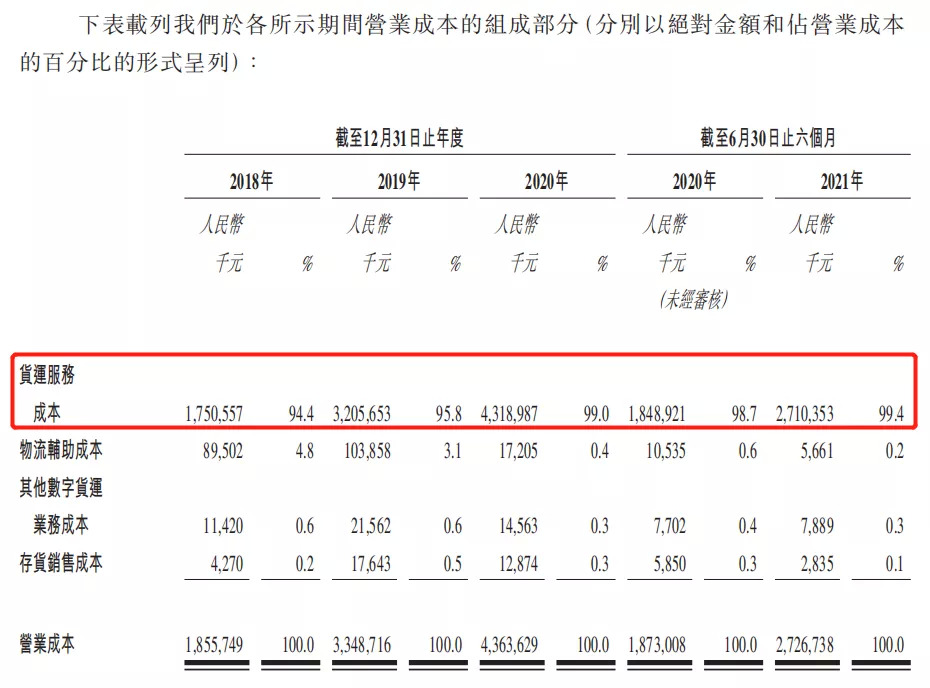 招股书显示,其营业成本几乎完全由货运服务成本构成,并增长迅速。报告期内,其货运服务成本额由2018年的17.51亿元增至2020年的43.19亿元。