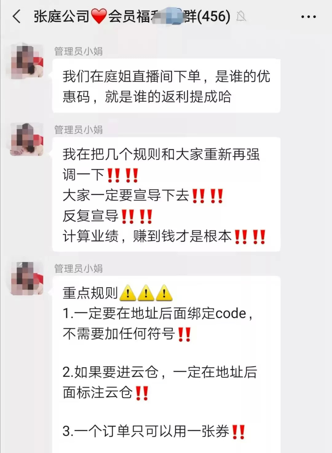 在张庭直播时,其社群管理员会要求大家做两件事:1,一定要在抖音收货地址后面绑定code;2,如果要进云仓,一定要在地址后标记云仓。”