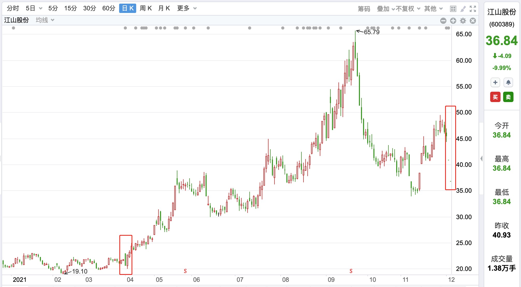 2021年3月29日,由于重大资产重组事项,江山股份股票停牌。直到4月13日才复牌,当日股价高开低走,最终录得5.75%的跌幅。不过,第二天(4月14日)开始股价一路上涨,当天最低股价19.45元,9月23日盘中最高涨到65.79元,5个月时间累计上涨2.38倍。