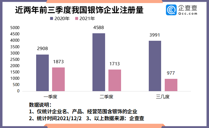企查查数据显示,2021年前11月,我国新增银饰相关企业5052家,同比减少160.69%。今年前三季度新增银饰相关企业明显少于去年。一季度新增银饰企业1873家,二季度新增1713家,三季度新增977家。