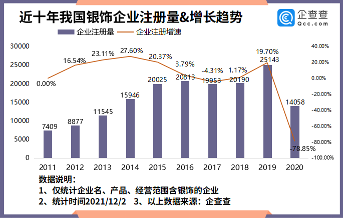 企查查数据显示,我国现存银饰相关企业11.73万家。近十年来,我国银饰相关企业注册量总体呈上升趋势。2018年我国新增银饰相关企业2.02万家,同比增长1.17%。2019年新增2.51万家,同比增长19.70%,是新增银饰相关企业最多的一年。2020年新增1.41万家,同比减少78.85%。