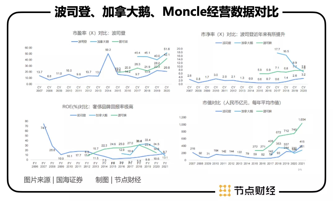 如上图所示,加拿大鹅、Moncle、波司登同场竞技,前两者的市盈率均在波司登之上。经节点财经研究,加拿大鹅和Moncle作为全球范围内公认的顶尖羽绒服品牌,享受的是奢侈品的估值逻辑,波司登则是按照纺织业来估值。孰高孰低,资本心里有杆秤。