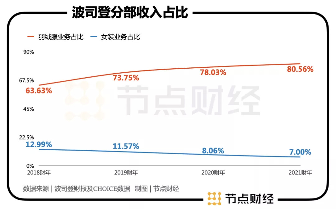 而在羽绒服越卖越好的同时,曾被波司登给予厚望的女装业务却行进在下滑通道中。