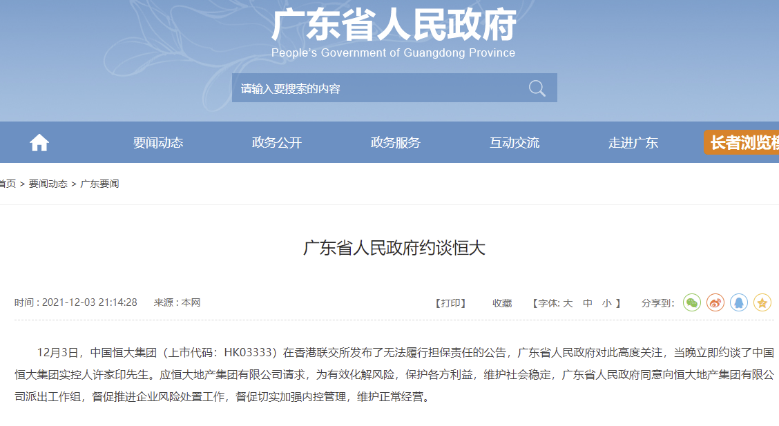 广东省政府网站消息,12月3日,中国恒大集团(上市代码:HK03333)在香港联交所发布了无法履行担保责任的公告,广东省人民政府对此高度关注,当晚立即约谈了中国恒大集团实控人许家印先生。应恒大地产集团有限公司请求,为有效化解风险,保护各方利益,维护社会稳定,广东省人民政府同意向恒大地产集团有限公司派出工作组,督促推进企业风险处置工作,督促切实加强内控管理,维护正常经营。