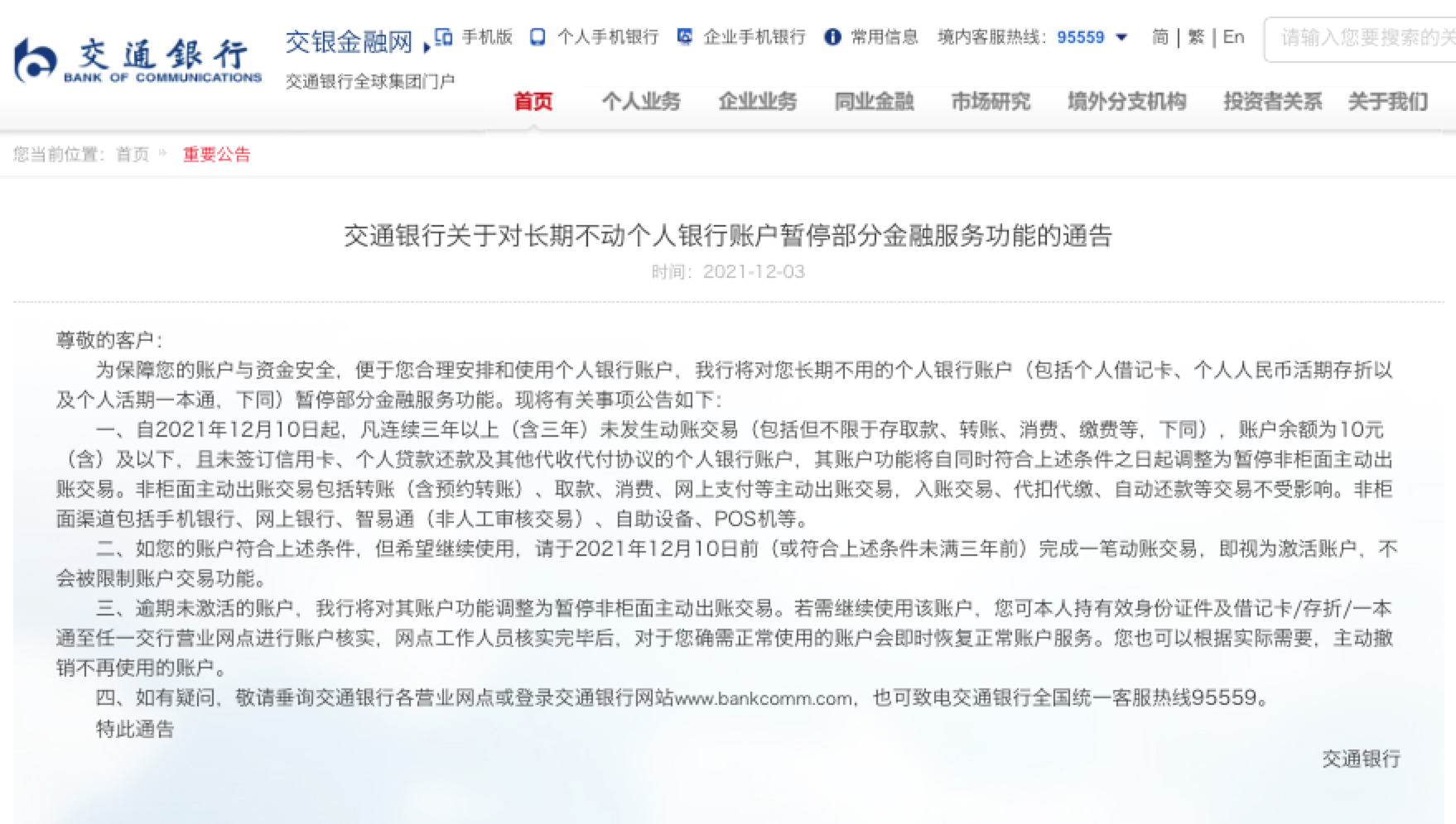 12月3日,交通银行在其官网发布关于对长期不动个人银行账户暂停部分金融服务功能的通告称,将对长期不用的个人银行账户(包括个人借记卡、个人人民币活期存折以及个人活期一本通,下同)暂停部分金融服务功能。