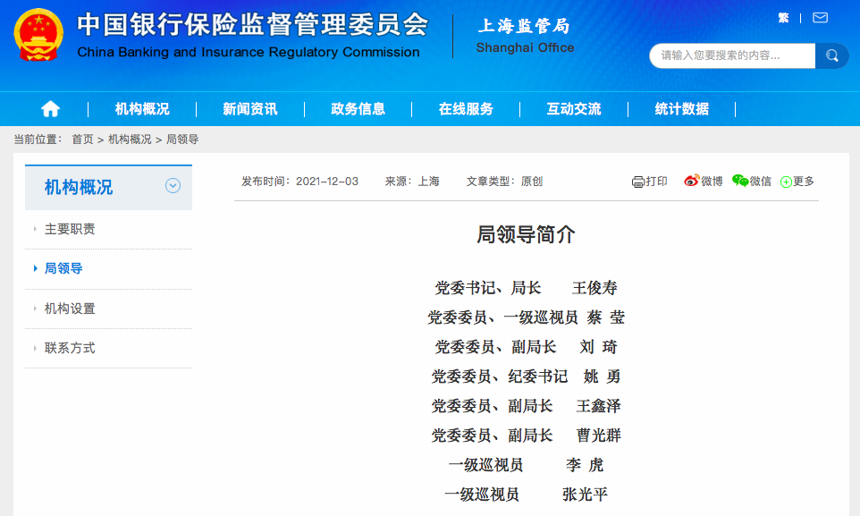 按照更新的局领导简介,上海银保监局领导班子为:党委书记、局长王俊寿;党委委员、一级巡视员蔡莹;党委委员、副局长刘琦;党委委员、纪委书记姚勇;党委委员、副局长王鑫泽;党委委员、副局长曹光群;一级巡视员李虎;一级巡视员张光平。