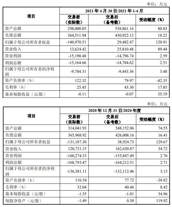 本次交易对上市公司主要财务指标的影响表现为,除了资产负债率下降,其他各项主要指标均呈现出增长。截至2021年4月30日的备考数显示,其中,*ST大唐资产总额将增至53.89亿元(增80.83%),归母所有者权益从-14.10亿元负值变为正数2.95亿元(增120.91%)。