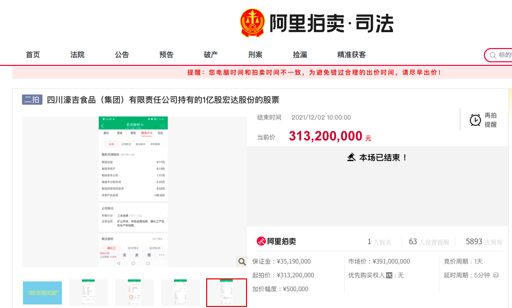 12月2日,淘宝司法拍卖网显示,四川濠吉食品(集团)有限责任公司(下称四川濠吉)持有的1亿股宏达股份(600331.SH)的股票二拍结束。此次拍卖对应起拍价为3.132亿元,保证金3519万元,1人报名,最后由其底价竞拍成功。