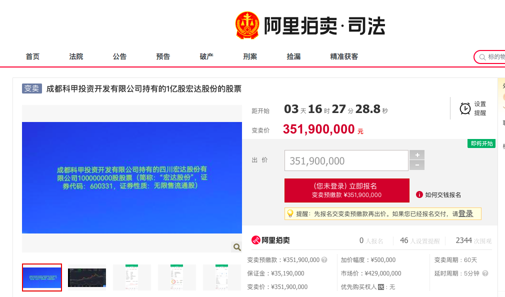 界面新闻记者检索淘宝司法拍卖网发现,除了此次二拍成功的四川濠吉持有的1亿股宏达股份外,成都科甲持有的1亿股宏达股份将于12月8日10点公开变卖,起拍价为3.519亿元,略高于四川濠吉持有的宏达股份拍卖成交价。